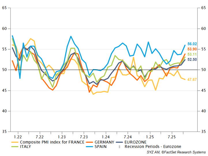 Chart 3: Eurozone receives positive economic activity signals from its PMI surveys – particularly the periphery is on a strong upward trend while France falls behind