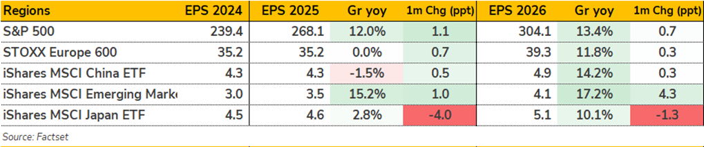 Looking ahead, we remain constructive on the earnings trajectory, as the US government shutdown is expected to be resolved in due course, while global liquidity remains supportive. For the fourth quarter, S&P 500 earnings are expected to grow 6% year-on-year and STOXX 600 earnings by 8%, as comparisons become easier. Into 2026, earnings growth is expected to become more balanced across regions and sectors as shown below.