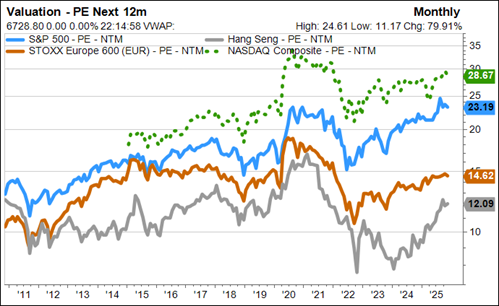 Equity valuations for large US companies remain elevated, although the growth and profitability of these mega-cap stocks are difficult to compare with historical standards. International equities appear more reasonably valued relative to their own history, but they do not benefit from the AI tailwind to the same extent as the US market. Within major markets, China has re-rated from less than 9x forward P/E in 2023–24 to around 14x currently, as investors once again view China as “investable”, the AI narrative gains traction, and consumer activity shows signs of bottoming.
