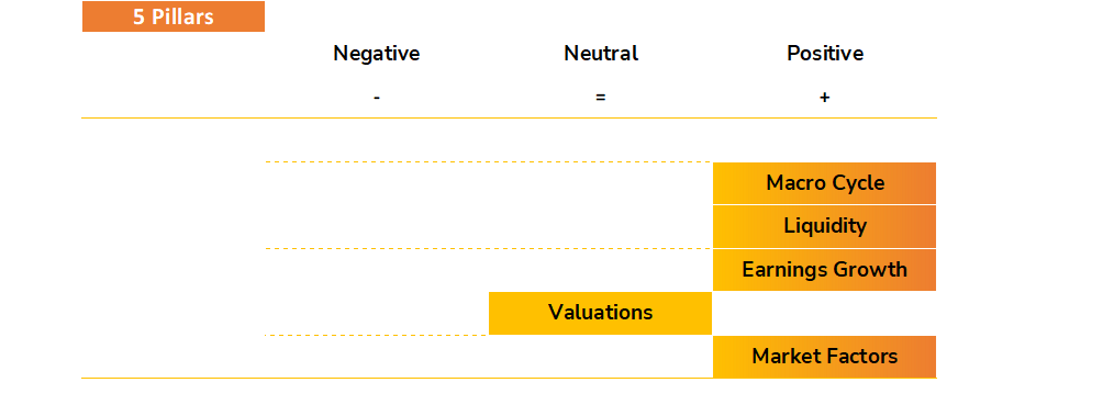 With 3 pillars (liquidity, earnings and market factors) signalling an overweight and 2 in neutral (macro, earnings and valuations), the weight of evidence is positive for equities.