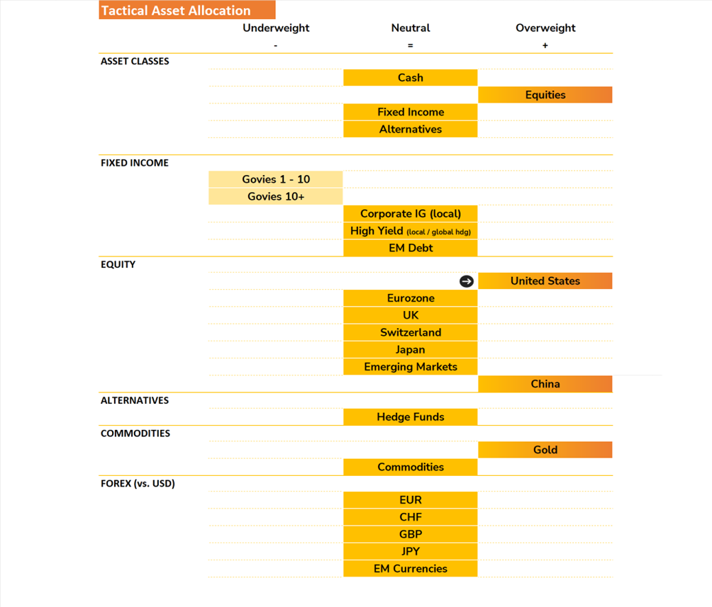 - Overall, the outlook remains positive for global equities, with hedge funds and gold serving as diversifiers. Investment-grade corporate bonds are preferred over sovereign debt, and currency positioning remains neutral between the dollar, euro, and Swiss franc.
