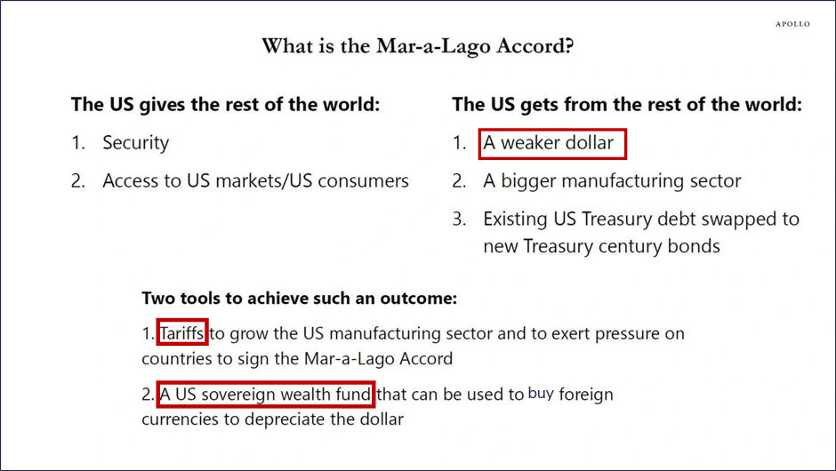 This is where the so-called “Mar-a-Lago Accord” comes in, an idea circulating in Trump’s economic circle that echoes the 1985 Plaza Accord. The core objective is to engineer a weaker dollar, restore US manufacturing competitiveness and deflate the real value of America’s ballooning debt.