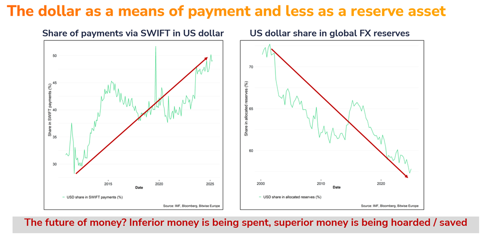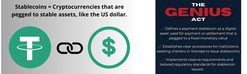 The expansion of the dollar as a means of payment could be further pushed by stablecoins. This is how the Genius act comes into play. In July of this year, President Trump signed a US federal legislation that establishes a comprehensive regulatory framework for stablecoins, a type of cryptocurrency designed to maintain a stable value by being pegged to a reference asset, commonly the US dollar.