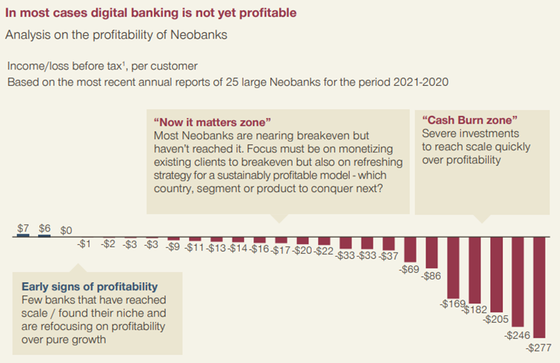However, the focus of neobanks on scale rather than profits left its marks. A report of 2022 by Simon-Kucher predicted the share of the world’s 400 neobanks that had turned profitable by then to less than 5%, but it should be noted that over half of the players weren’t even three years old at that time. In 2023, 80% of the neobanks were still unprofitable. The number of neobank closings or acquisitions is threatening to outnumber the quantity of neobank introductions. The reason for these profitability issues is structural: launching a digital bank demands heavy upfront investment and ongoing costs, from building secure digital infrastructure to integrating third-party services, complying with complex regulation, and employing full-stack technology teams such as developers, product owners, and data scientists, alongside legal, risk management, and marketing staff. Customer acquisition campaigns, often through generous perks and fee-free services, only added to the bill.