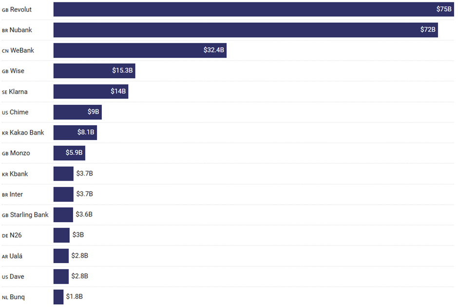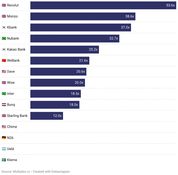 Source: Valuation of the largest neobanks, Multiples.vc