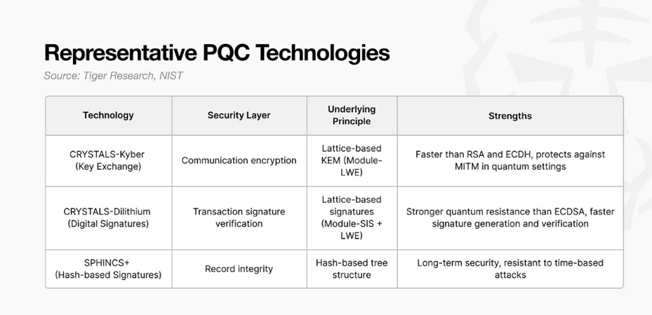 Right now, bitcoin relies on Elliptic Curve Cryptography (ECC), specifically the “secp256k1” curve, to generate public and private keys. This system uses ECDSA signatures to verify transactions, but powerful quantum computers could eventually break it, putting funds and transaction security at risk. A practical approach is adopting post-quantum cryptography (PQC), which provides quantum-resistant security. Networks can implement PQC gradually, replacing vulnerable algorithms over time rather than rebuilding the system from scratch.PQC would introduce a three-layer defence: Kyber secures communication between nodes and wallets to prevent interception, Dilithium verifies transactions and protects private keys from quantum attacks, and SPHINCS+ preserves the integrity of transaction records, turning each transaction into a unique, tamper-proof fingerprint.