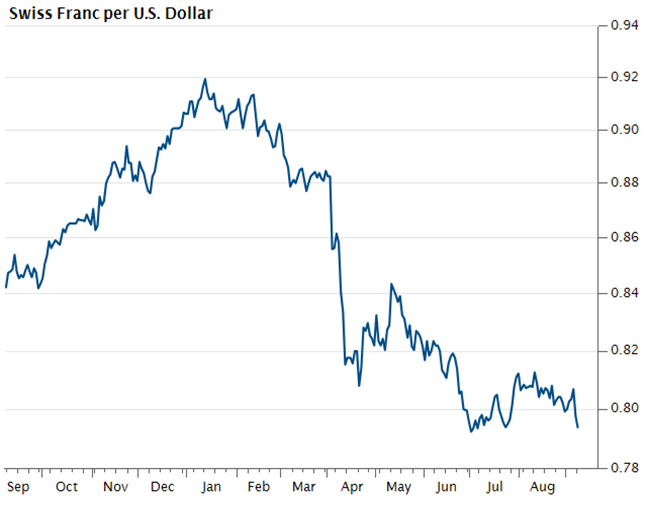 Following this announcement, the MSCI Switzerland Price Index plunged by 15%, like many other indexes around the world, before recovering as markets adjusted to the 90-day negotiation period. Meanwhile, the US dollar weakened sharply against the Swiss franc, losing roughly 13% over the period before rebounding partially in April and May.