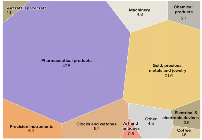 As shown in the chart, the US is Switzerland’s biggest trading partner representing nearly 20% of all Swiss goods exports.