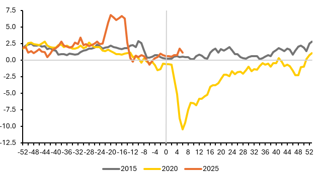 Considering these elements, we can infer that although these tariffs will have a tangible negative impact on Swiss real GDP, the effect will likely remain digestible as seen through this chart with the comparison to the 2015 Swiss Franc appreciation and the 2020 COVID-19 pandemic. A period of weak real GDP growth is awaited, however, a catastrophic scenario resembling the 2020 down trend is very unlikely as seen through the first two weeks’ moderate reaction.