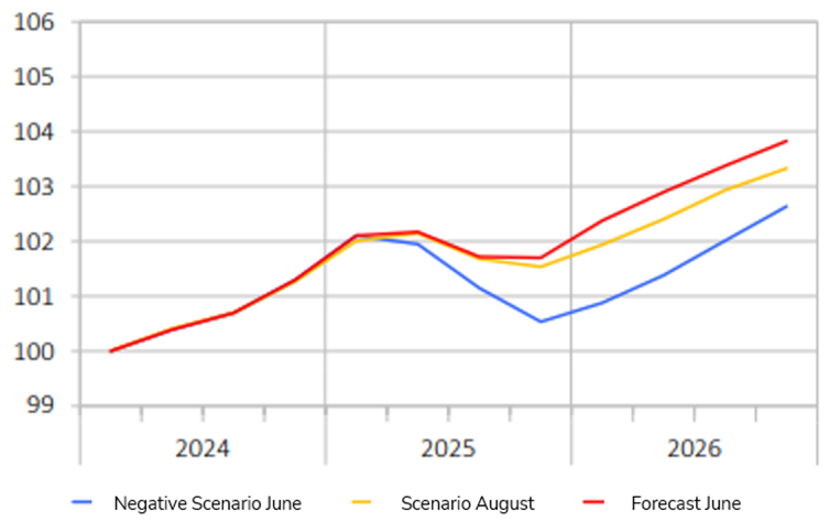 This view is confirmed when looking at the most recent SECO forecasts of Swiss real GDP, the expected decline in economic growth remains significant although digestible from an overall perspective. The extreme negative scenario predicted in June 2025, where not only Switzerland but also more important US trading partners like the EU and China or Japan would start to retaliate, letting the trade dispute’s negative effects on the global economy escalate, became unlikely. The most recent scenario of August 2025 predicts a decline in real GDP during Q3 and Q4 of 2025 followed by a pick-up in growth in 2026 dismissing the hypothesis of a catastrophic scenario resembling, for example, the 2008/2009 financial crisis.