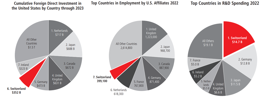In R&D spending, Swiss companies led all foreign players in 2022, with $14.7 billion invested, accounting for 18% of all research spending by foreign affiliates. This figure surpassed investments from traditional economic powerhouses including Germany, Japan, and the United Kingdom.