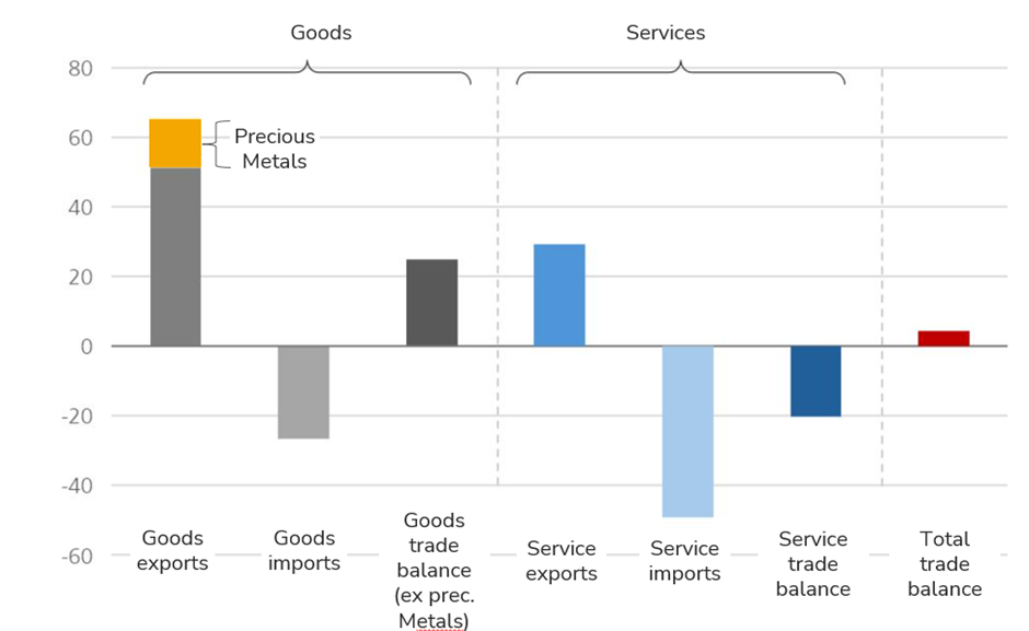 Switzerland may appear to benefit from a goods trade surplus with the US, but the data is skewed by a small number of high-value sectors, primarily pharmaceuticals and precious metals like gold which fall outside tariffs. Once gold transactions are excluded from the calculation, the bilateral goods surplus becomes much more modest, painting a fairer picture of bilateral trade dynamics. It is not a case of trade manipulation or unfair advantage. Additionally, although Switzerland recorded a goods trade surplus of roughly almost 38.7 billion francs in 2024, it simultaneously ran a 20.4 billion francs deficit in services, resulting in a relatively modest net surplus.