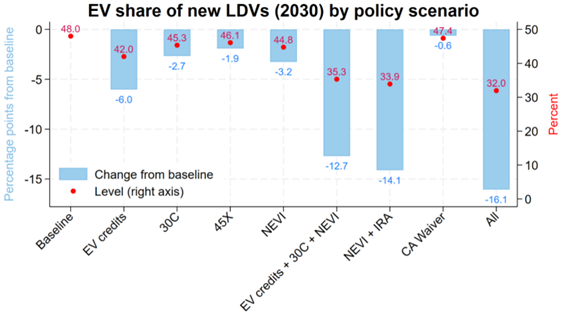 Harvard’s Salata Institute modelled the impact of rolling back EV policies. Under the Inflation Reduction Act (IRA), EVs were expected to capture 48% of new vehicle sales by 2030. Removing just the consumer tax credits cuts this to 42%. When combined with halted infrastructure funding, weakened state mandates, and revoked emissions rules, adoption could drop further to roughly one-third of new sales.