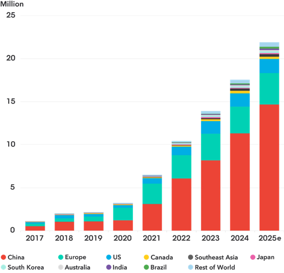 Globally, EV adoption has soared: approaching 25% of new car sales in 2025. With China leading the charge, Europe aggressively enforcing quotas and subsidies, the US is veering off the main track.