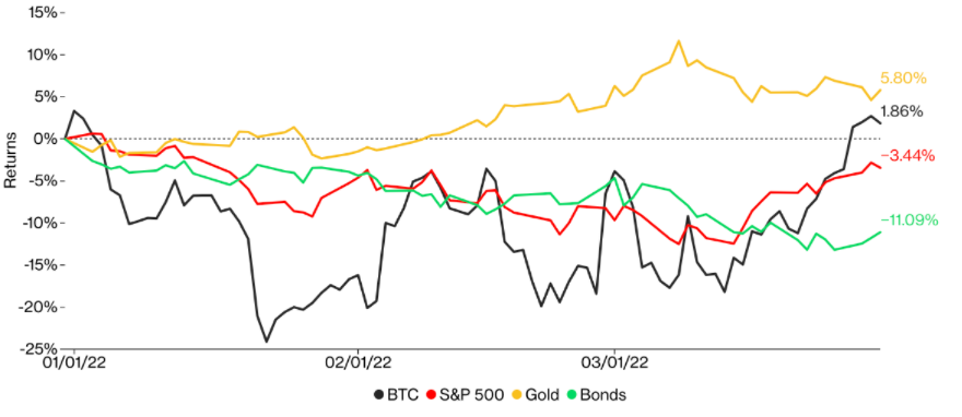 The dollar was higher in Q1, trading back into the pre- COVID range and to its highest monthly close since July 2020. Expectations for faster monetary tightening in the US contributed to a rally in the dollar, which finished the quarter up about 3% against both the pound and the euro. FX markets once again reflect the rise and fall of nations. The Ruble is down -9% over the quarter but is not the weakest currency year-to-date as the Turkish Lira did even worse (almost -10%). Brazil Real (+17.6%) and South-Africa Rand (+9%) appreciated on the back of strong commodity markets. Cryptocurrencies had a tough Q1. Bitcoin had one of its worst-ever starts to a year trading as low as $34,000 in February. But thanks to a strong recovery in the last part of the quarter, Bitcoin performance is almost unchanged over the quarter. Note that the correlation between bitcoin and the S&P 500 hit its highest level ever (nearly 0.9). Despite a strong performance in March Ethereum is down over 10% in Q1.