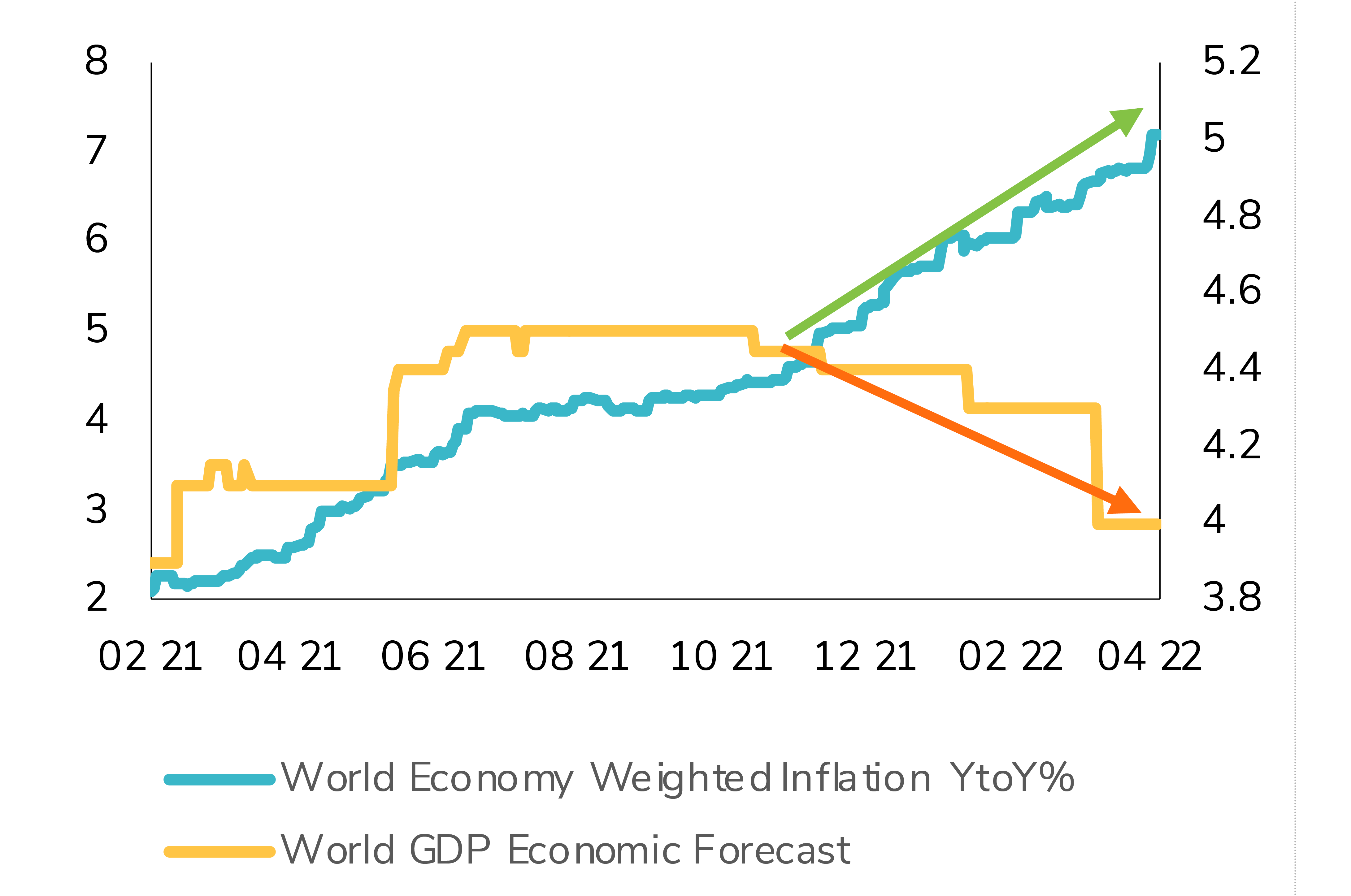 World GDP forecast (orange line) and World Economic Weighted Inflation