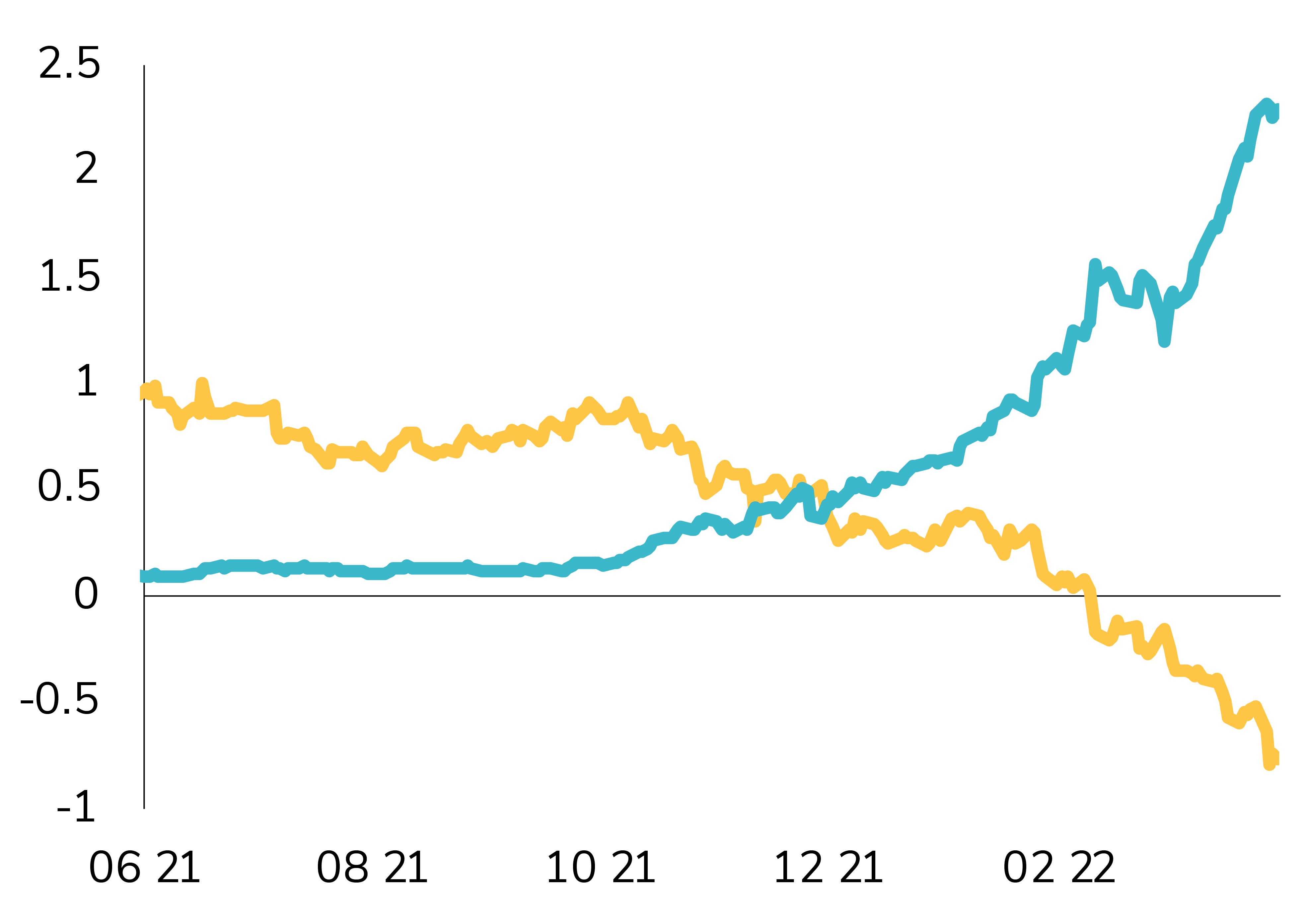 On the 16th of March, the Fed's FOMC tightened interest rates for the first time since December 2018. While Chairman Jerome Powell initially called the post-vaccine inflationary pressure “transitory”, Fed officials have moved away from that stance and are set to follow central bank peers, like the Bank of England, with multiple rate hikes in 2022. The US continue to face strong rents and wages inflation. In the meantime, sanctions on Russia have led to additional upward pressures on commodity prices, which are likely to push inflation rates to even higher levels. Sanctions and renewed Covid cases in China could both lead to additional supply chain bottlenecks. Investors have been adjusting their expectations accordingly, pricing in a fast and brutal rate hike cycle in the short-term with potential negative consequences on growth (and thus rates) later on. At the short-end of the yield curve, we saw an unprecedented divergence as the market is now pricing in 9 rates hikes in 2022 (vs. 2 hikes a few montsh ago) and 3 rates cuts in 2023/2024 (versus 2 hikes a few months ago).