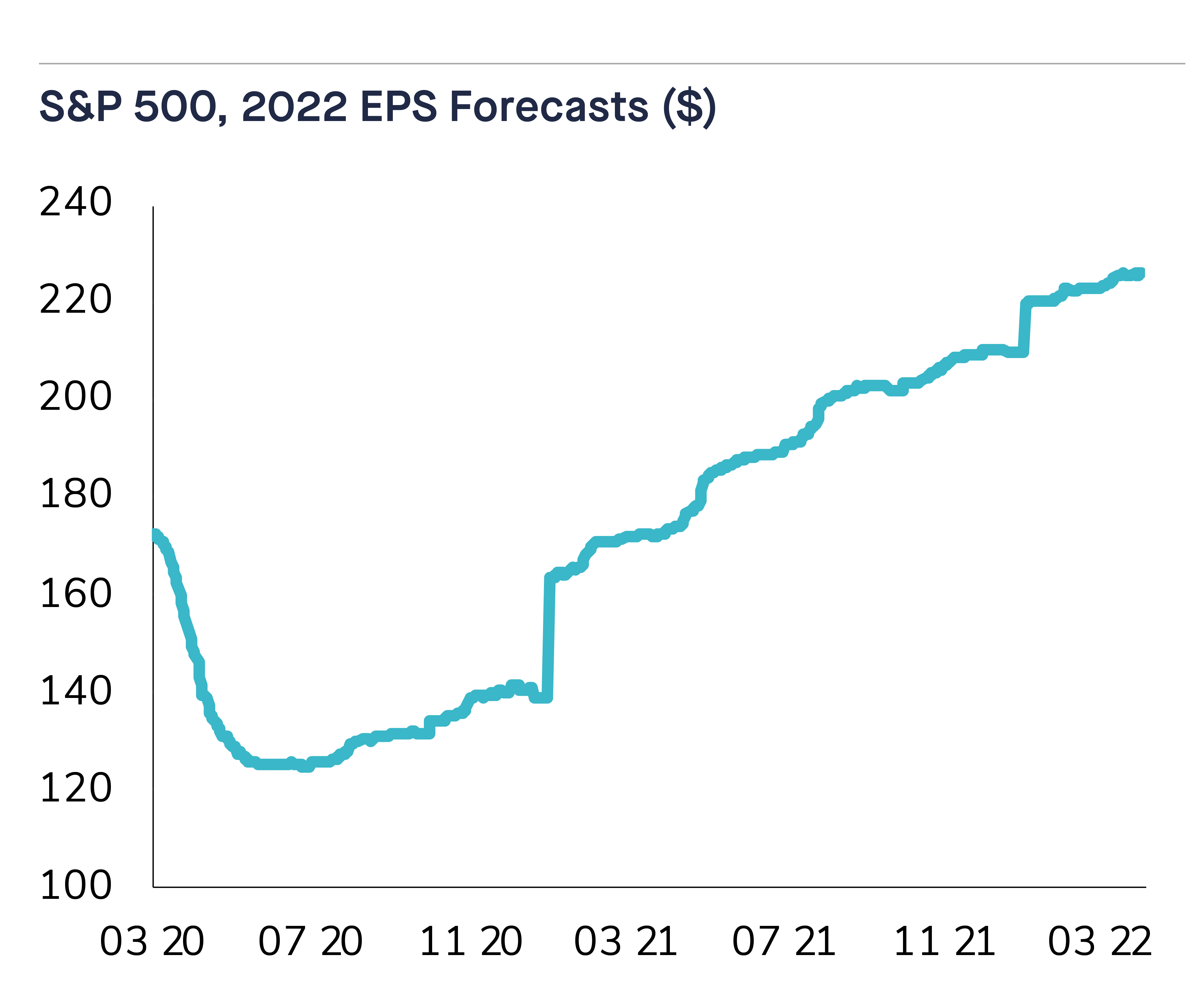 Despite all these negative headlines (war, inflation, etc.), there are some bright spots including two areas of relative strength in the U.S. economy. First, the U.S. consumer remains healthy: unemployment rate fell to 3.6% -- a post- pandemic low – and average hourly earnings are increasing at a solid pace (+5.6% year-over-year). U.S. households overall are entering the year with over $2.5 trillion more in savings than before the pandemic began, which offers some cushion in the face of rising borrowing costs. On the corporate side, balance sheets and earnings growth have been resilient: we continue to see earnings revisions for 2022 edging higher. Typically, analysts revise their earnings growth expectations downward for the year in the face of the events we saw in Q1. But we have not seen this trend yet. Expectations for S&P 500 earnings growth are now at 9.1%, up from 7.0% at the end of last year.