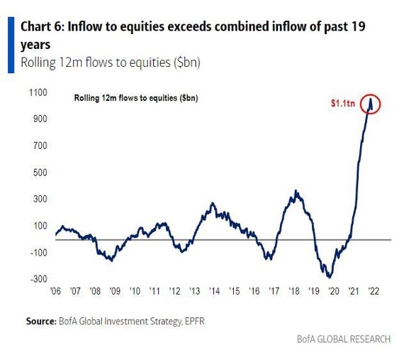 Most major equity markets ended the first quarter of 2022 lower, with the S&P 500 down about -5.0% (total return -3.4%), while the Nasdaq ended down around 8%. This is the 2nd worst start to a year for stocks still since 2008 (only the COVID crash was worse). March was a bit of a bright spot, however, as the major averages enjoyed a solid two-week rally during the second half of the month. Nasdaq rallied a stunning 17% off the mid-March lows (in 10 days) and the S&P was up almost 12% during the same period, thanks to a massive short squeeze. We note the great rotation between fixed income funds and equity funds is finally underway as investors believe that stocks are a much better hedge against inflation than bonds. As such, fixed income funds suffered major outflows in Q1 (-$80bn) while equity funds recorded inflows despite the negative news flow (war, inflation, Fed, etc.).
