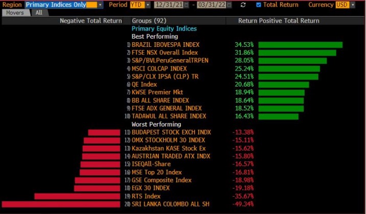 From a sector standpoint, Energy stocks (+39%) were Q1's massive winner with Utilities the only other sector to end in the green. Communication Services (-11.2%), Consumer Discretionary (-9.4%) and Tech (-8.4%) were the quarter's biggest laggards. Over the quarter, developed market value stocks were only down 0.5% while growth stocks fell nearly 10% on the back of rising bond yields. We note however that growth stocks started to outperform in March as Mega- Cap tech stocks rebounded massively in late-March (but still remain lower in Q1). From a country standpoint, stock markets from commodity-rich countries such as Brazil, Peru & the Saudi Arabia were the main beneficiaries last quarter. Russia's stock exchange was the 2nd weakest with a drop of 36%. Sri Lanka fared even worse, with its stock market nearly halving in dollar terms.