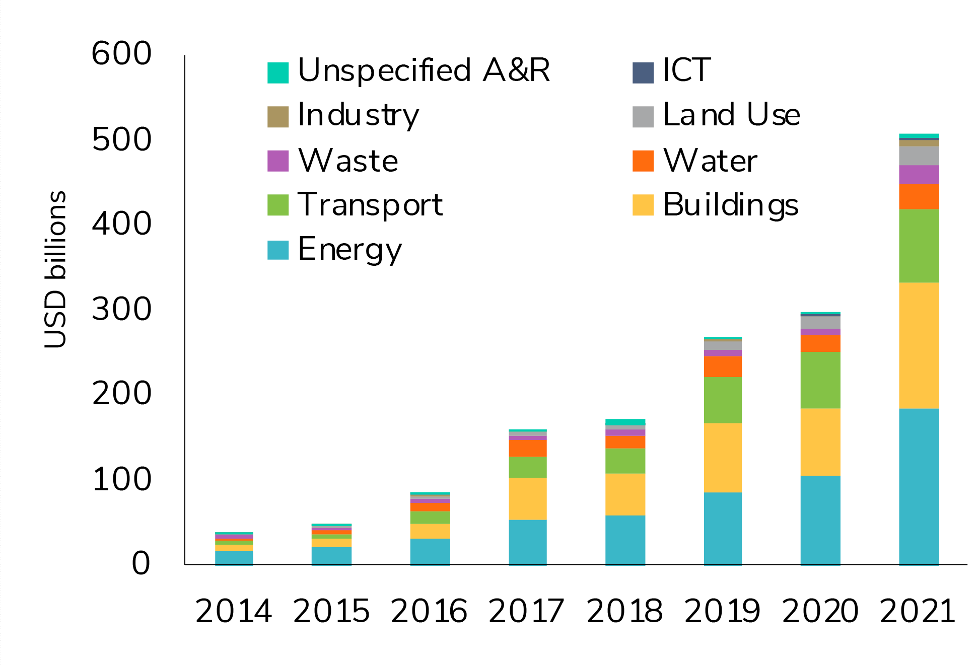 Around two thirds of the funds raised are used for the energy and construction sectors. The energy sector mainly includes measures for electricity and heat. Companies from the private sector seem to be taking very specific measures to reduce the energy they consume. Apple, for example, has invested around USD 1.1 billion from a total of USD 2.5 billion in green bonds in the development park in Cupertino and other sustainable buildings. This alone enables the company to save 1.2 million tonnes of CO2 emissions annually. At the same time, renewable energy production facilities with a capacity of 571 megawatts were installed, 91,000 tonnes of waste were avoided, 360 million litres of water were saved, and several other measures were achieved thanks to the issuance of the green bond.