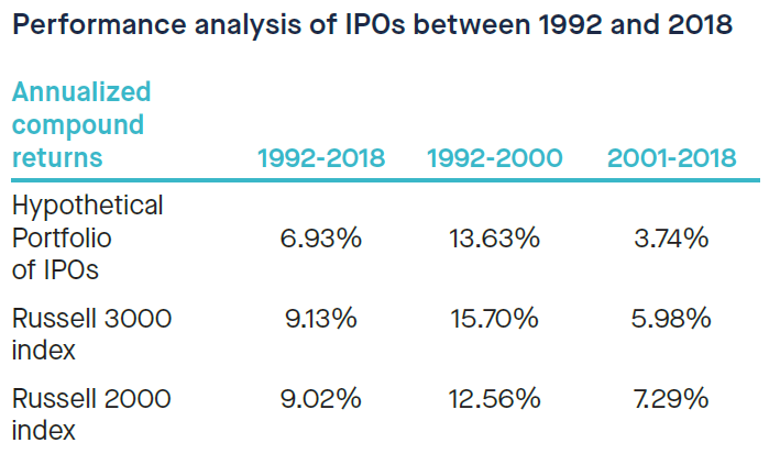 The portfolio consisting of IPOs underperforms the Russell 3000 Index over both the overall period and the two sub-periods. For example, IPOs generate an annualized return of 6.9%, 13.6% and 3.7% over the full period, the 1st sub-period (1992-2000) and the 2nd sub-period (2011-2018), compared to 9.1%, 15.7% and 6% for the Russell 3000 Index over the same time horizons.