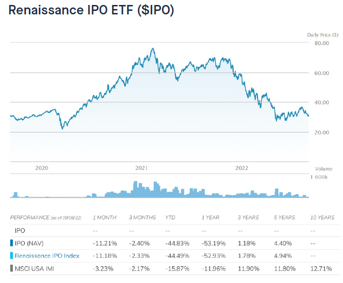 While this study covered a period between 1992 and 2018, the more recent performance of stocks that went public in less than 3 years has been very mixed. As the chart below shows, the Renaissance IPO ETF ($IPO) had generated spectacular returns in 2020 and 2021 but has since collapsed (-44% year-to-date). The ETF clearly underperformed the US market over the 1-year, 3-year and 5-year periods.