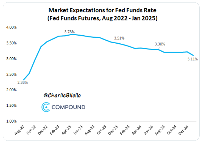The equity market is not convinced by these assumptions and does not seem to give much credibility to Mr Powell who has tightened too much in 2018, stimulated too much in 2021, and is now trying to emulate Paul Volcker at a time when core PCE inflation (released last week) is at its lowest level (4.6%) since October.