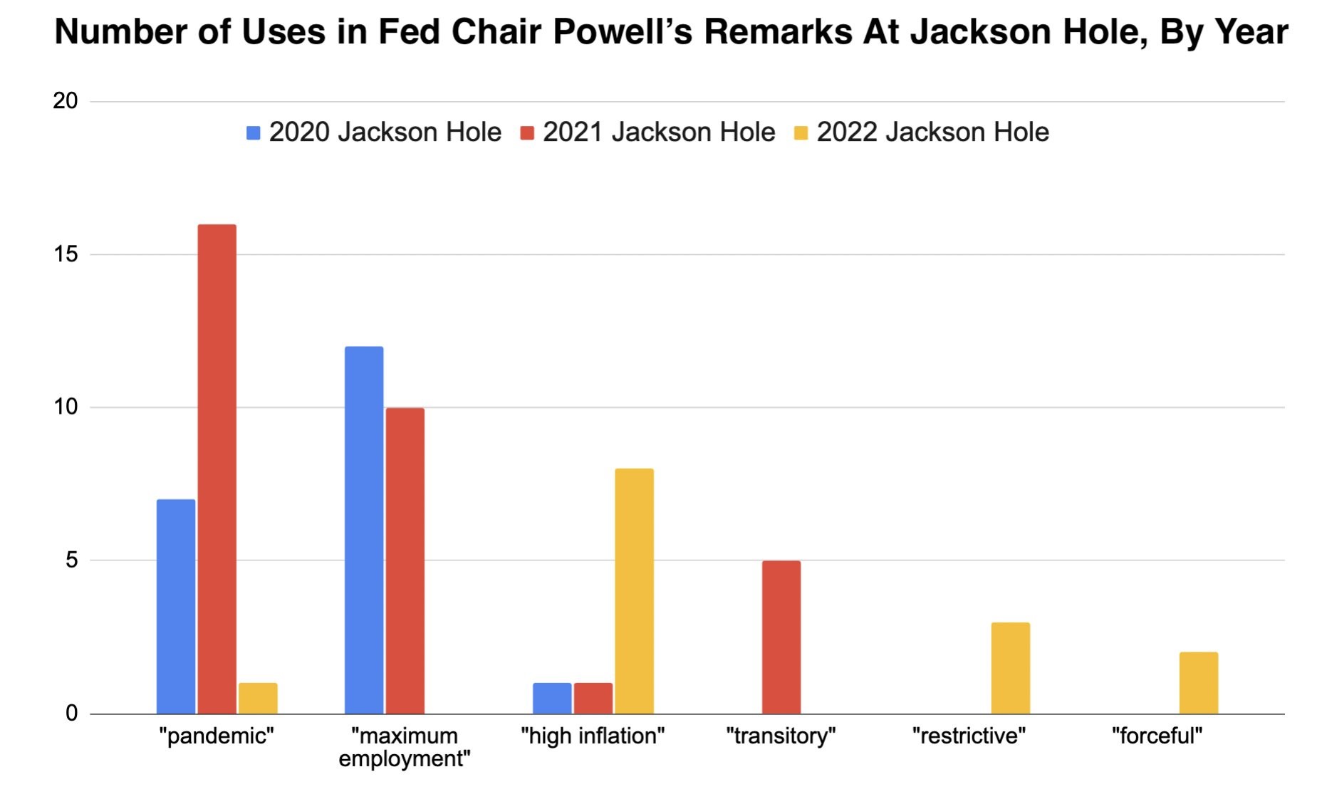 Number of times Mr Powell quoted the following words in his Jackson Hole speech in 2020, 2021 and 2022