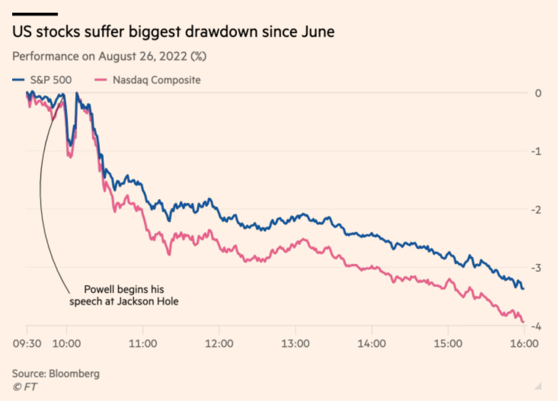 US stocks fell sharply after Powell's speech. The S&P 500 index fell 3.4%, while the Nasdaq Composite, dominated by technology stocks that are more sensitive to interest rate expectations, lost 3.9%. This was the biggest daily decline for both indices since mid-June.