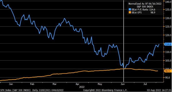 S&P 500 P/E (blue line) vs. estimated earnings per share (orange line) since June 16, 2022