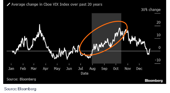 It is worth remembering that volatility historically tends to increase between mid-August and mid-October (see chart below). Here we are...
