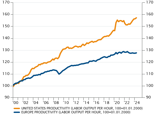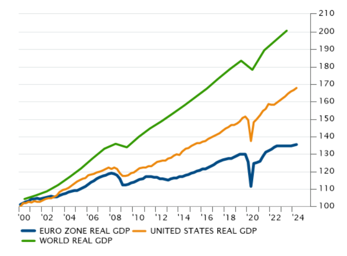 The first estimate of GDP growth for the third quarter will be released at the end of the month in the Eurozone, but don’t hold your breath. It will most certainly be weak and disappointing, as it has been over the past two years. Since the end of the fiscally driven post-pandemic boost, growth has been anemic in Europe, and the GDP is barely up since Q3 2022. A number of specific headwinds have affected the Eurozone, such as energy supply disruptions, weak Chinese demand for industrial and manufactured European goods, tight monetary policy and reduced fiscal support. But Europe mostly suffers from structural flaws that have hampered its ability to grow over more than two decades now. In this context, Mario Draghi’s report on “The future of European competitiveness”, released in September, is a milestone for economic policies on the Continent. It unambiguously summarizes the reasons behind the growth slowdown since the start of the century, and it brings forward what needs to be done to save Europe from “a slow agony”. Europe needs to grow faster, not only in the short run after the recent deterioration in economic indicators, but over the longer run as well in order to preserve its place in the new world economic order that is taking shape.
