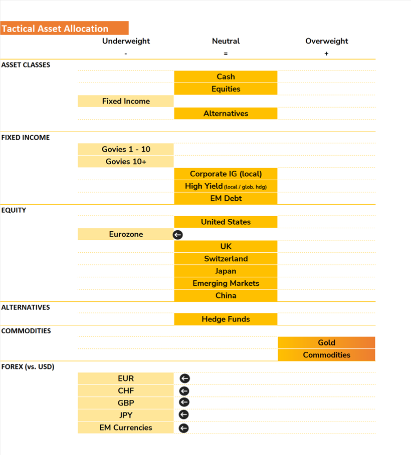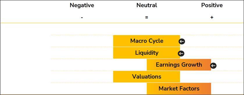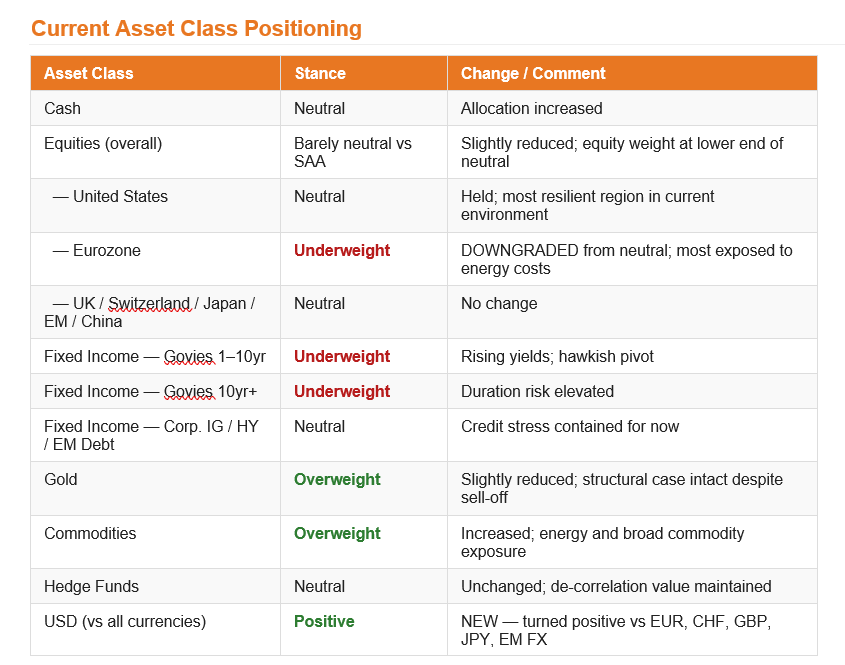 SYZ employs a five-pillar framework — Macro Cycle, Liquidity, Earnings Growth, Valuations, and Market Factors — to derive its tactical asset allocation. The week saw three of those five pillars downgraded, reflecting the deteriorating near-term outlook. The Macro Cycle pillar has moved from moderately positive to neutral, acknowledging that the prospect of a sustained growth and moderate inflation environment has been meaningfully compromised. The Liquidity pillar has followed the same path: higher inflation expectations have reduced the probability of the two rate cuts that markets anticipated before the conflict began, and the strengthening dollar — historically a headwind to global liquidity — is adding further pressure. The Earnings Growth pillar has been downgraded from positive to moderately positive; earnings remain resilient for now, but higher energy costs and rising interest rates will almost certainly drive negative revisions, particularly in energy-sensitive regions. Valuations remain neutral, and Market Factors remain moderately positive — the latter reflecting the relative resilience of US technical and breadth indicators compared to Europe.