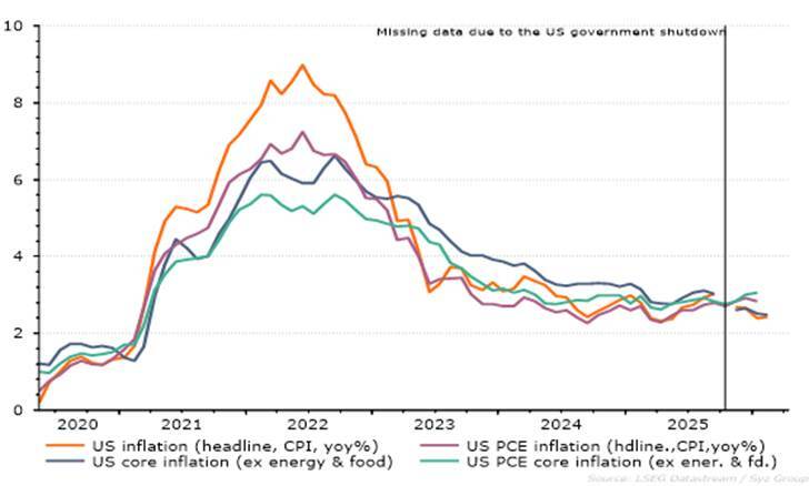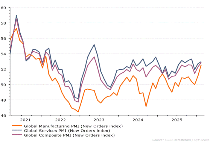 China’s growth outlook is mixed. The government is trying to balance tariff impacts through fiscal stimulus aimed at domestic demand — especially services, which remain weak. The temporary tariff truce offers tactical relief but does not resolve structural issues. Industrial overcapacity persists and weighs on profitability. Real‑estate imbalances continue to depress confidence and investment. Recent data show pockets of improvement, yet momentum is fragile. Higher global energy prices will weaken output despite policy support. Inflation has moved toward 1%, reflecting still soft but healing demand. The energy shock adds mild upward pressure, but the anti-overcapacity industrial program of the government suppresses pricing power.