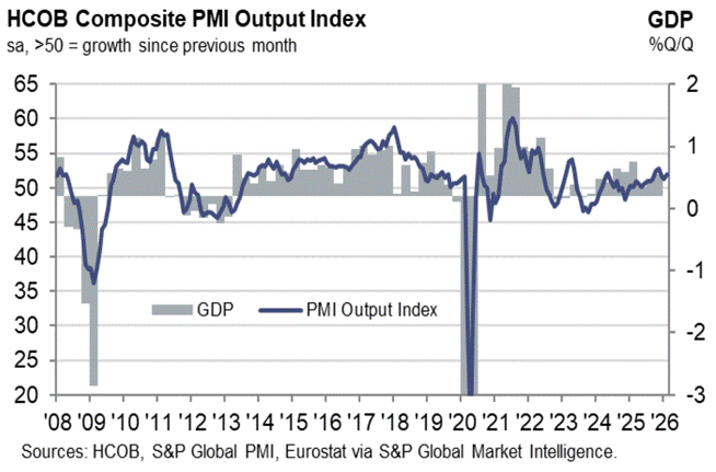 The growth outlook in the Eurozone showed signs of recovery, supported by fiscal stimulus and improving consumer and business sentiment. Consumer confidence is stabilising from low levels, and business surveys are slowly improving. The energy shock linked to the Middle East crisis clouds the outlook, as prolonged elevated prices could restrain domestic demand. US tariffs and the wars in Iran and Ukraine continue to weigh on confidence. Political risks in France seem to be abating, removing one layer of uncertainty, but the recovery remains fragile.