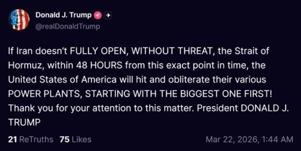 That framing encapsulates the week's defining tension. On Sunday, Treasury Secretary Bessent attempted to reconcile Trump's apparently contradictory signals on NBC's Meet the Press, arguing that escalation and de-escalation are not mutually exclusive. The US, he suggested, may need to intensify its military campaign in order to create the conditions for ending it. Within days, Trump issued a 48-hour ultimatum threatening to destroy Iran's power grid and largest nuclear power facility if the Strait was not fully reopened. The threat represented a significant policy shift: just days earlier, the US had publicly committed to avoiding civilian infrastructure. Threatening nationwide blackouts for 90 million people is a different doctrine entirely.