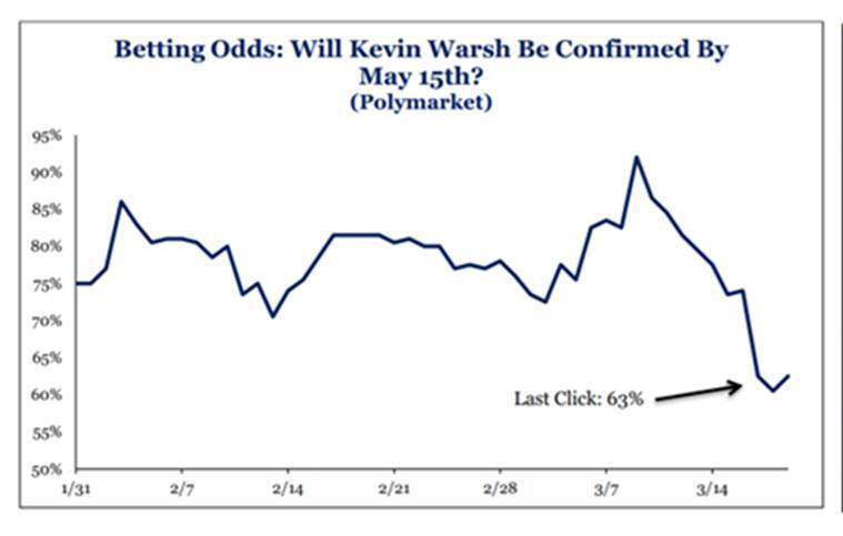 Complicating the monetary policy picture is an unusual degree of institutional uncertainty at the top of the Federal Reserve. Powell explained during his press conference that he intends to remain on the Board of Governors for as long as a criminal investigation related to his tenure is underway, and that he will serve as pro-tempore Chair until Trump's nominee, Kevin Warsh, is confirmed by the Senate. Prediction markets are currently pricing approximately 63% odds of Warsh's confirmation by 15 May. The prospect of a Fed Chair transition during an active geopolitical and economic crisis adds a layer of uncertainty to the policy outlook that markets are only beginning to price.