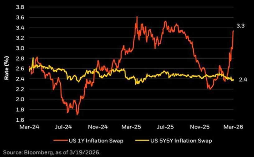 SYZ Research draws an important distinction in interpreting this data. Short-term inflation expectations — captured in one-year inflation swaps — have risen to 3.3%, driven by the energy shock and geopolitical risk premium. But long-term expectations — the five-year forward inflation swap, which captures what investors expect inflation to average over the five-year period beginning five years from now — remain anchored at 2.4%. This is the number that matters most to the Fed. If long-term expectations were breaking higher, the central bank would face genuine pressure to hike. The fact that they remain contained gives policymakers the room to stay patient and treat the current inflation spike as a one-off supply shock rather than an entrenched change in inflation dynamics.
