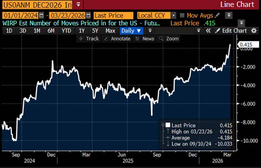 Markets have gone from pricing two cuts to pricing half a hike over the course of the Iran crisis.