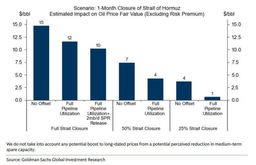 Goldman Sachs estimates current prices already embed an ~$18 per barrel risk premium, roughly equivalent to a six-week full halt of Hormuz flows. A full one-month closure could add $10-15 depending on offsets such as spare pipeline capacity or SPR releases. Markets appear partially positioned ahead of the event, suggesting the war premium may be significant but ultimately temporary.