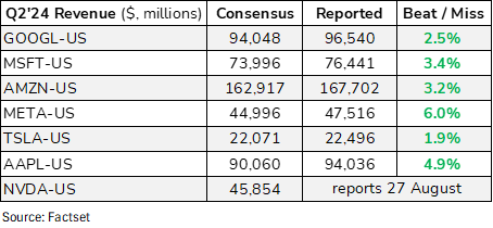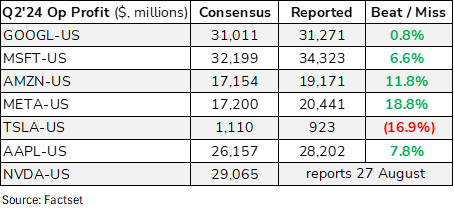 Logic suggests “big” companies should slow as they mature due to the law of large numbers, while smaller disruptors outgrow them—yet the Mag-7 defy this. Already the world’s largest businesses, they not only keep growing, but Q2 growth rates accelerated, comfortably beating consensus estimates. Operating profit beats were broad-based too– Tesla being the lone exception.