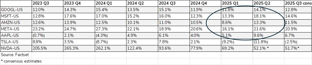 Investors focus on the first three, more visible ways to monetise AI. In fact, Cloud revenue is probably the most closely watched metric. And indeed, cloud revenue growth has accelerated notably in Q2: Microsoft Azure rose 39% YoY, up 6 %-points from the prior quarter, Google Cloud +34% YoY, up 3 %-points, and Amazon Web Services acceleration was only a 60bps, to +17.5% YoY (though H2 comments were upbeat). All in all – the market got another proof point that AI monetisation is happening.