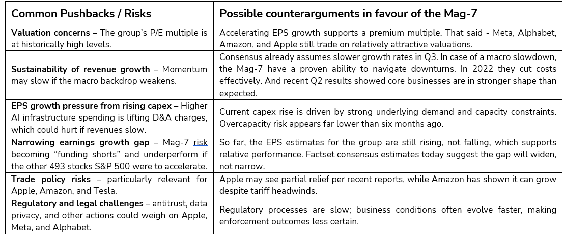 Investor concerns remain. While each of the Mag-7 is a distinct business with its own strengths and challenges, in this note we focus on the most common group-level pushbacks and outline potential counterarguments to each.