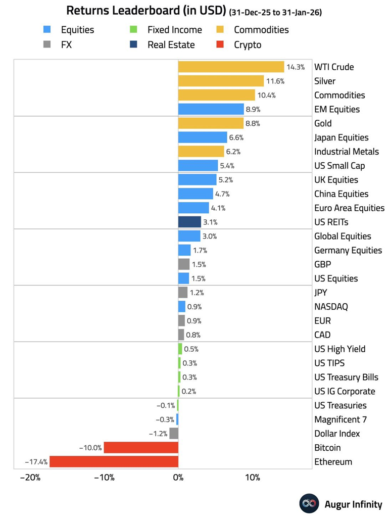 The commodities sector delivered robust returns, with the Bloomberg Commodity Index rising 10%. Energy was a primary driver; WTI Crude climbed 14.3%, while natural gas prices in both Europe and the US surged in response to unseasonably cold winter weather. Silver is up +11.65% and gold +8.8%