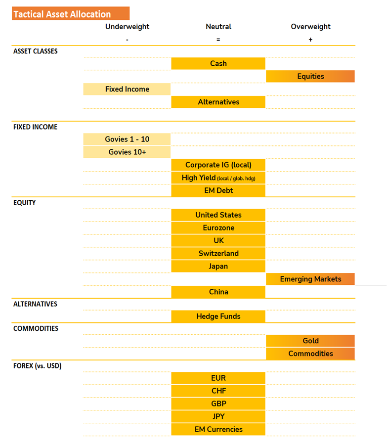 • We remain overweight equities with a preference for emerging markets and the US. We stay overweight gold and overweight commodities, underweight Govies 1-10 years , and neutral the dollar against all currencies.