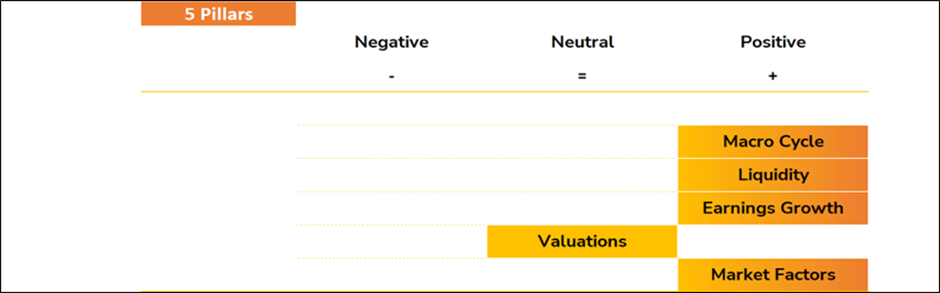 With 4 pillars (macro, liquidity, earnings and market factors) signalling an overweight and 1 in neutral (valuations), the weight of evidence is positive for equities.