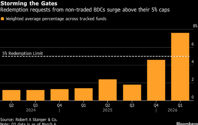 This is exactly what is happening now. Redemption requests from non-traded BDCs surged past the 5% quarterly threshold in Q1 2026 in many funds.
