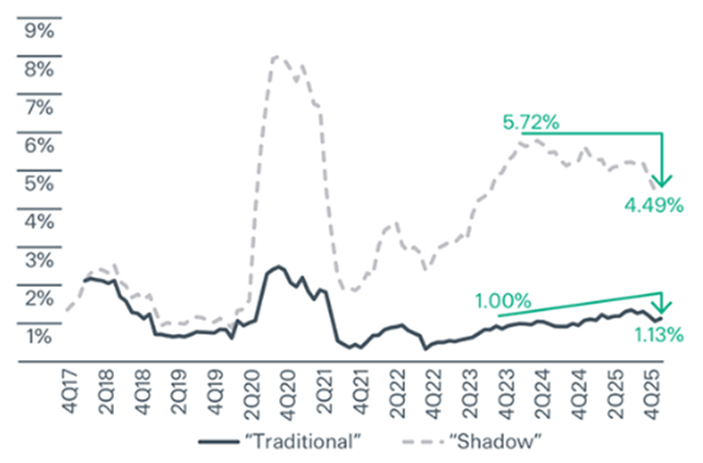 StepStone Group’s February 2026 paper provides helpful data here. As of December 2025, the shadow default rate for middle-market loans had declined to around 4.5% from a top at 5.72% in Q4 2023. During the same period, the default rate slightly increased. This must be put in context of an unusually low default post Covid environment, where government support program artificially pushed default rates lower.