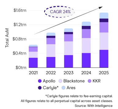 Blackstone, the world’s largest alternative asset manager, is down roughly 30% from its November 2024 highs. It recently touched its lowest level since late 2023, as concerns around private credit redemptions and the evergreen model weighed on sentiment. Private asset manager stocks were priced for years of compounding fee growth, driven by the expansion of private credit into the wealth channel. That narrative, which underpinned much of the sector’s re-rating in 2023–24, now appears to be on pause.